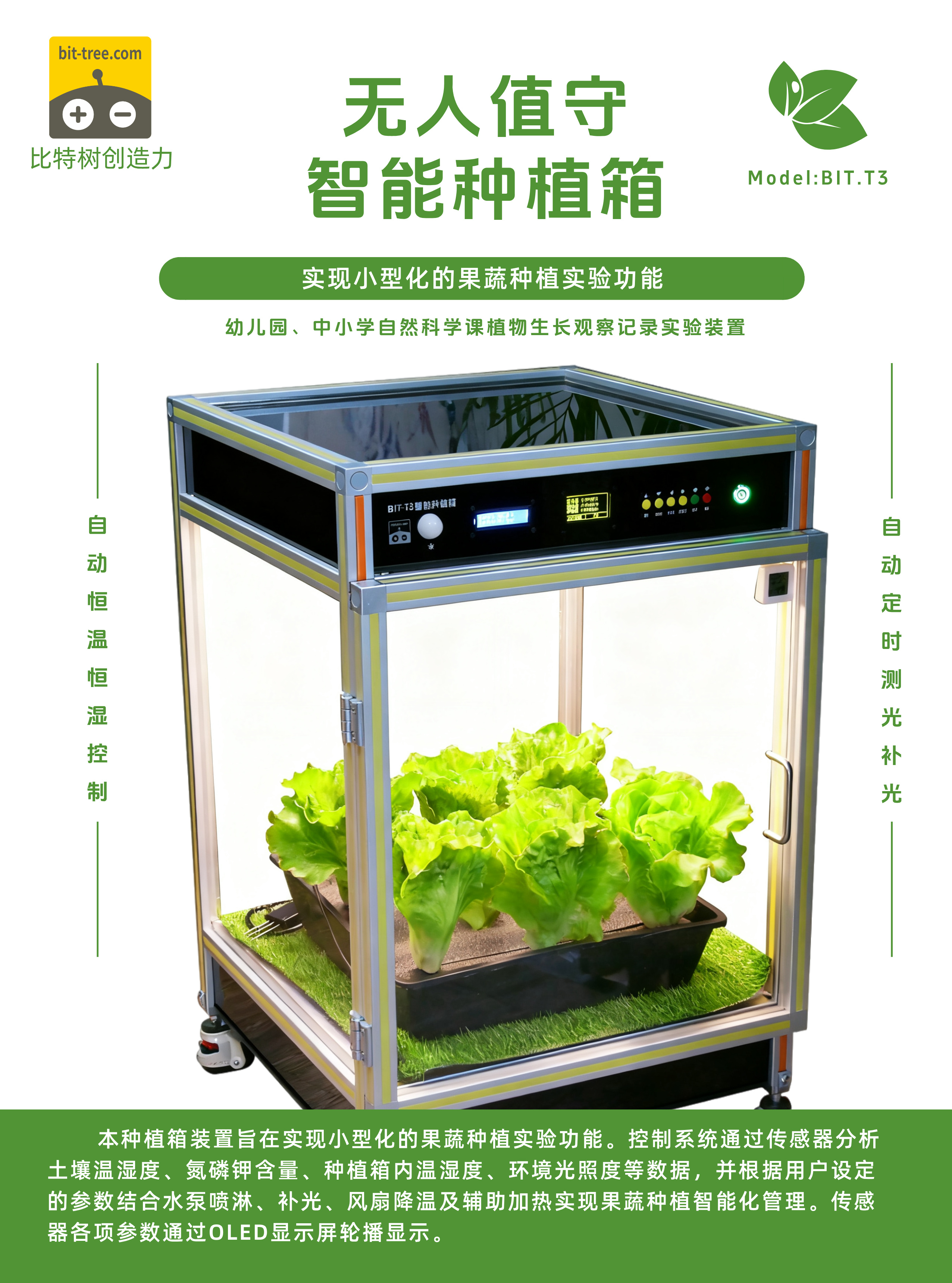本种植箱装置旨在实现小型化的果蔬种植实验功能。控制系统通过传感器分析土壤温湿度、氮磷钾含量、种植箱内温湿度、环境光照度等数据,并根据用户设定的参数结合水泵喷淋、补光、风扇降温及辅助加热实现果蔬种植智能化管理。传感器各项参数通过OLED显示屏轮播显示。