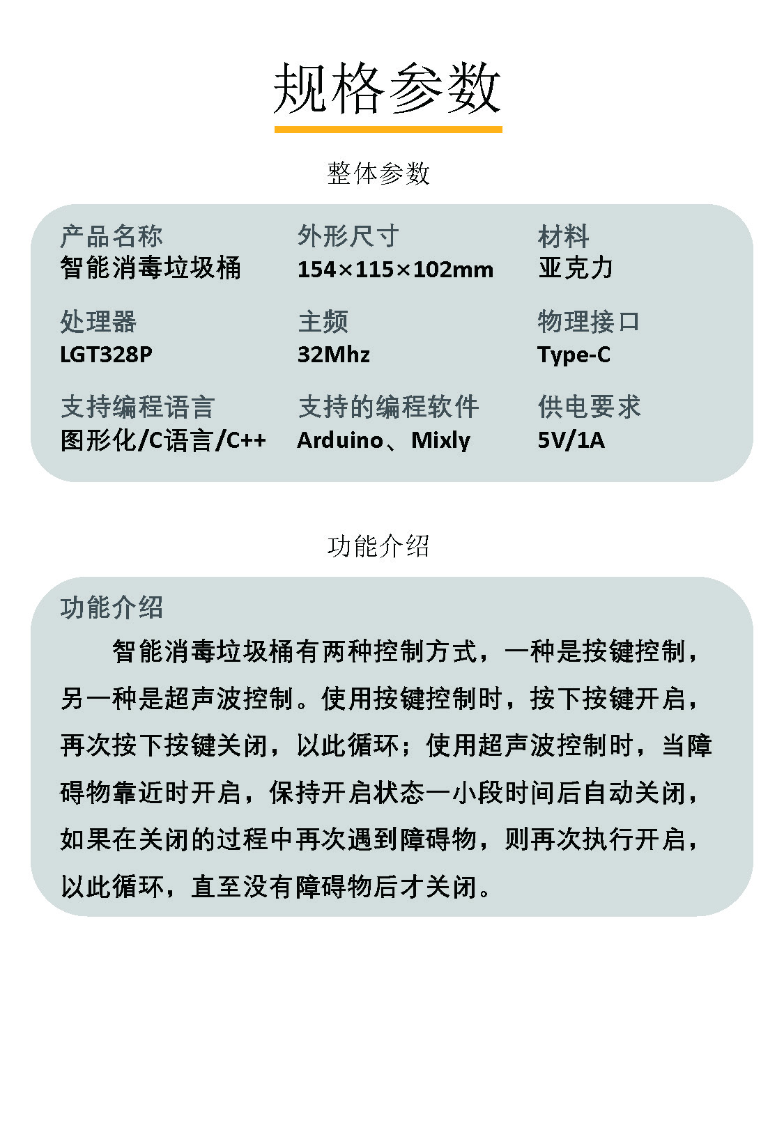 智能消毒垃圾桶通过超声波传感器探测手的距离来打开和关闭盖子,在每次丢完垃圾并关闭盖子后自动打开UV紫外灯消毒。程序部分会学习到多重条件判断、循环、数据类型等知识。