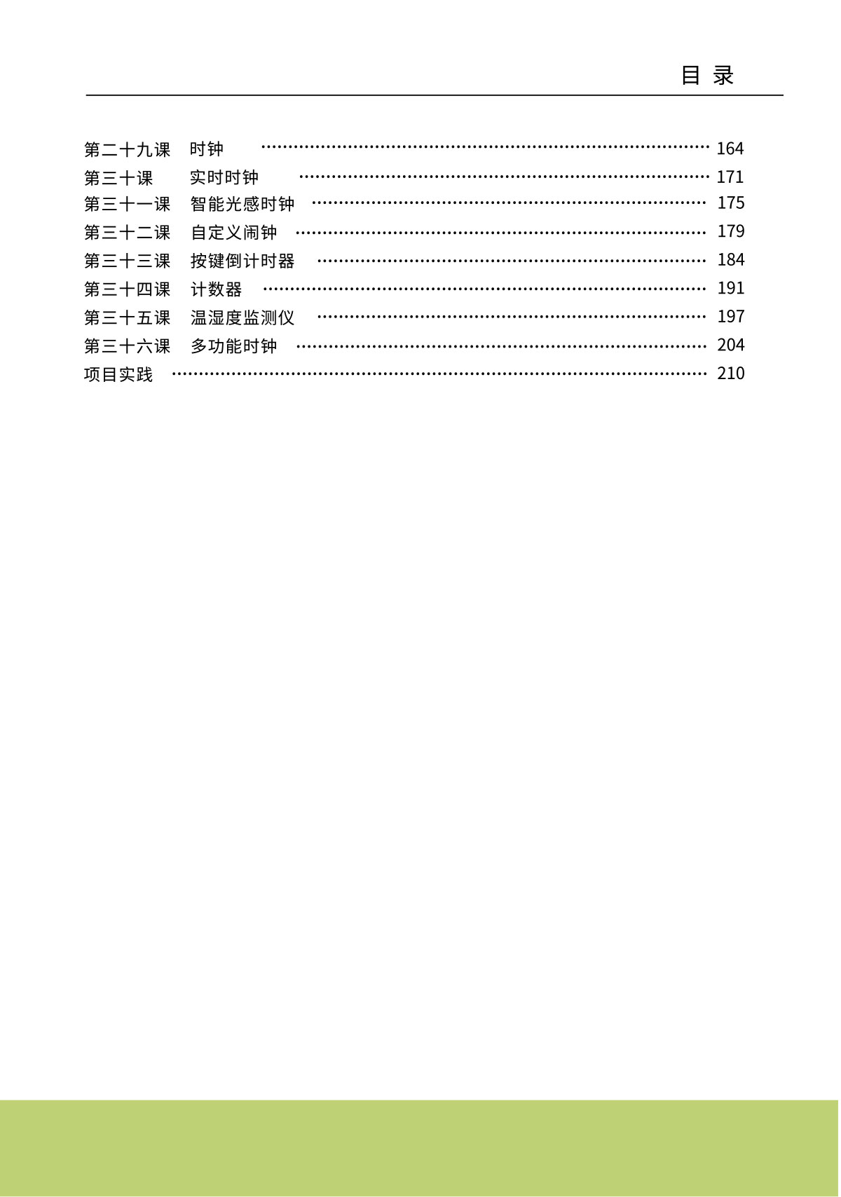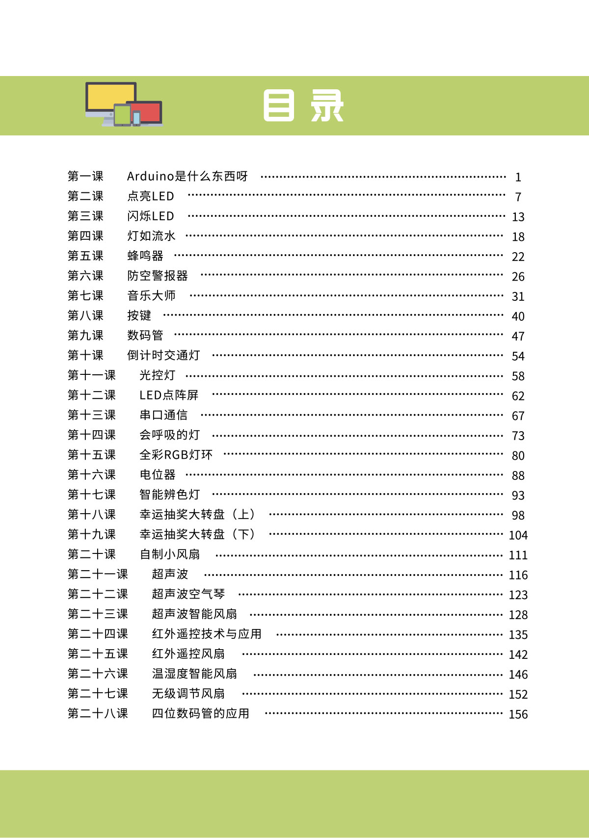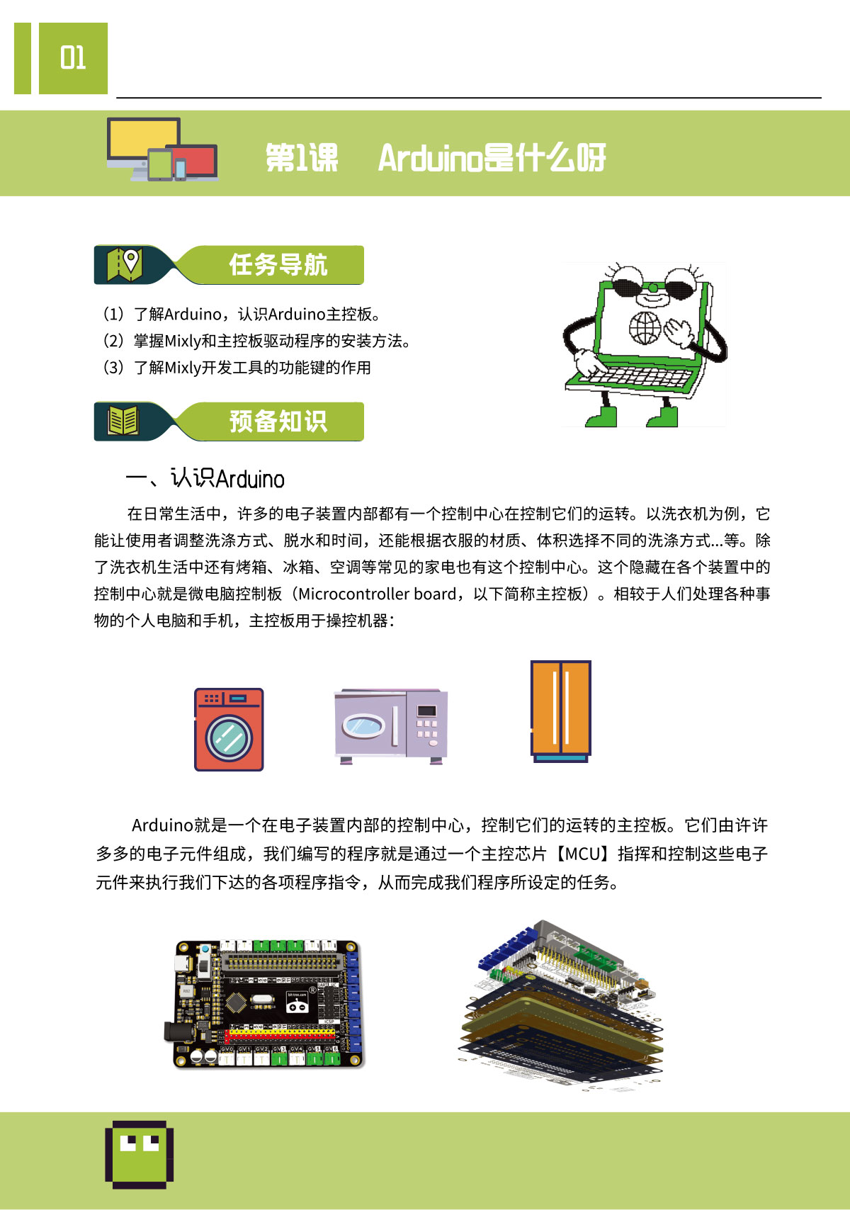 通过丰富的项目实践,引导读者深入了解基于Mixly图形化下Arduino编 程及其应用。内容从基本概念点灯、流水灯、一位数码管、蜂鸣器到两位数码管、电机、舵机、串口通信、超声波、红外等综合常用项目的开发。 初学者可以通过亮灯,代码编写,了解程序基本流程和编程技能。 随着技能的提高,读者可以尝试多传感器结合提高中级应用能力。高 级项目如红绿灯、幸运大转盘、智能风扇控制系统和多功能,则挑战读者的设计和实现能力。本册适合初学者学习,也适合中小学的信息技术教师和创客教师作为参考。