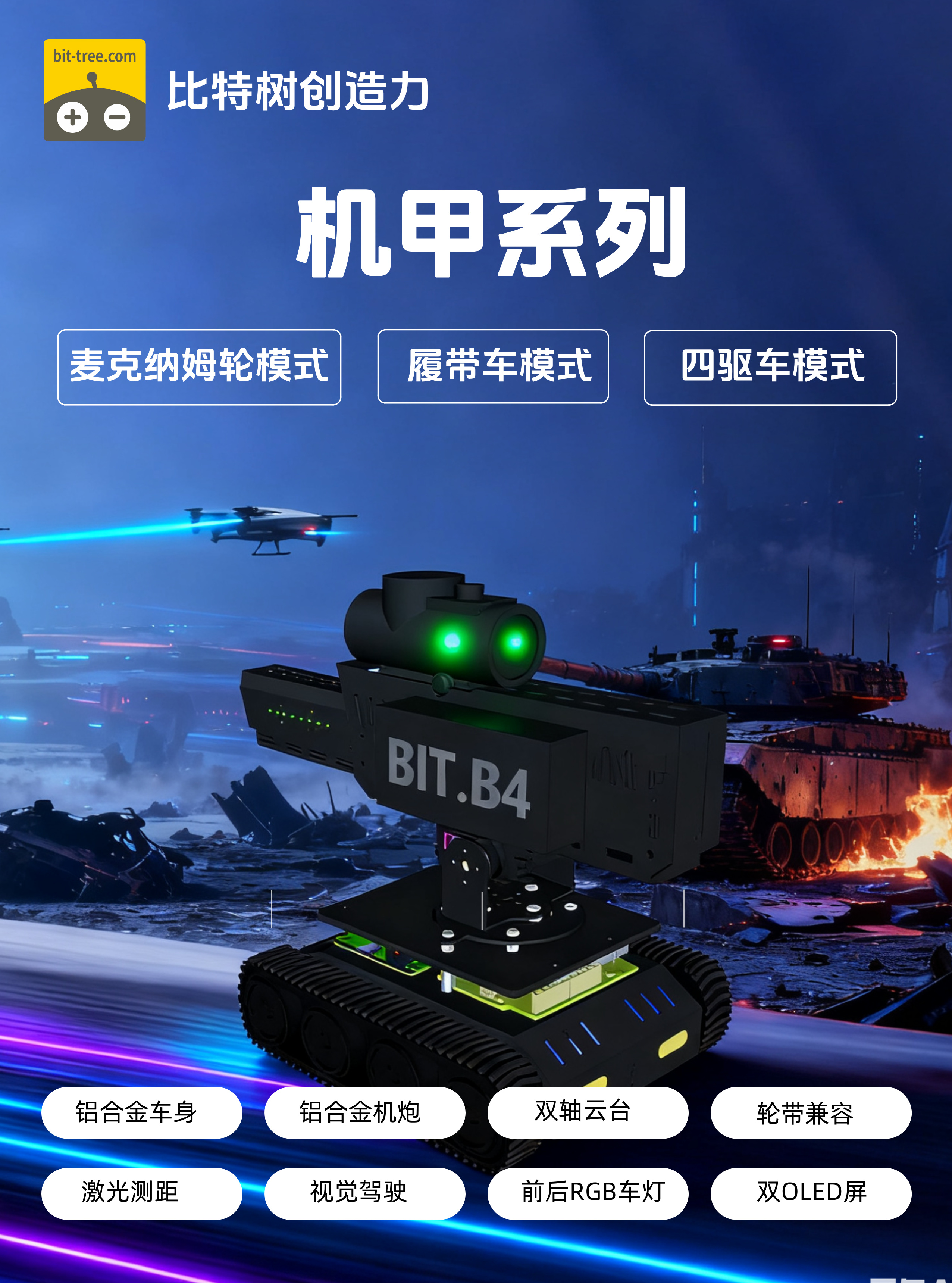 铝合金车身、激光测距、铝合金机炮、视觉驾驶、双轴云台、前后RGB车灯、轮带兼容、双OLED屏