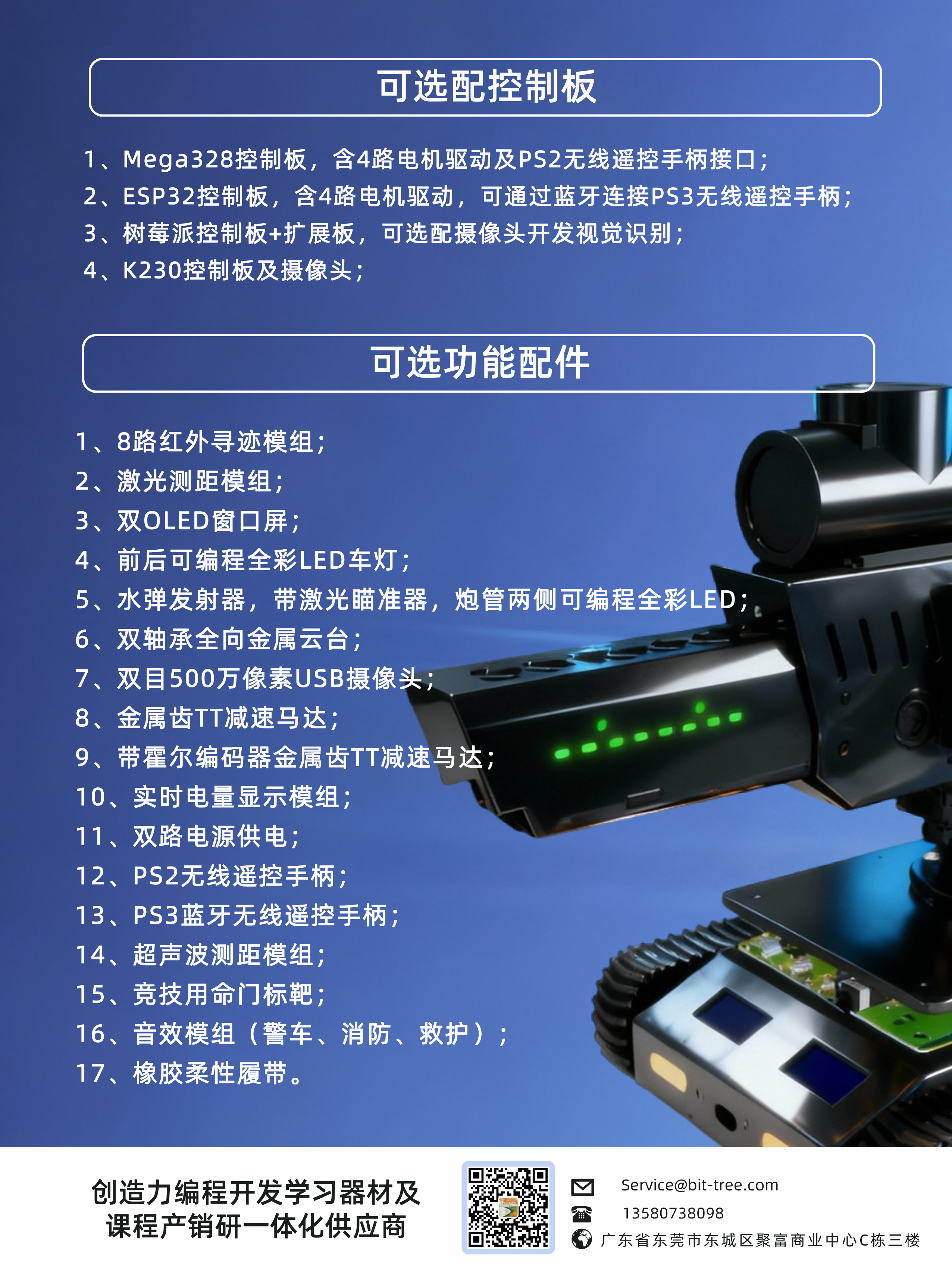 可选配控制板 1、Mega328控制板,含4路电机驱动及PS2无线遥控手柄接口: 2、ESP32控制板,含4路电机驱动,可通过蓝牙连接PS3无线遥手柄; 3、树莓派控制板+扩展板,可选配摄像头开发视觉识别; 4、K230控制板及摄像头;