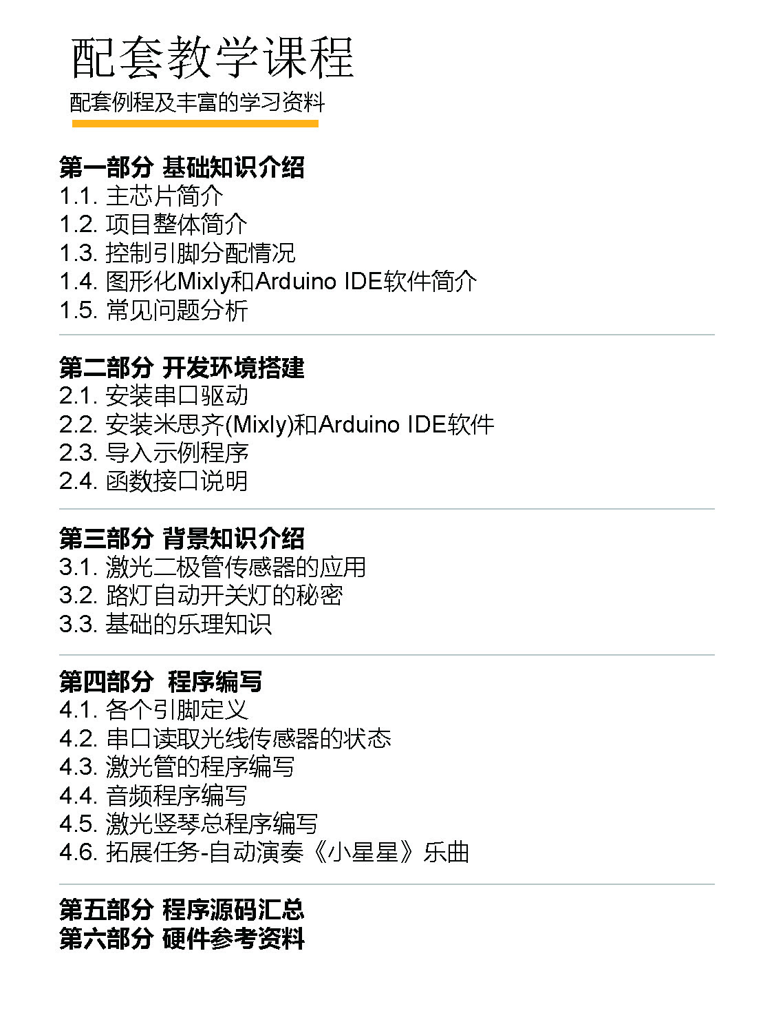 没有琴弦的竖琴见过吗?该项目使用激光来模拟8根琴弦,当手指遮挡住其中一条激光琴弦时就通过喇叭发出对应频率的声音,每条激光琴弦都对应了不同的声音。项目会学习到光和乐谱知识,通过编写不同的程序还能够实现自动演奏乐曲功能,非常有趣。该项目实操组装稍难,程序编写相对容易。